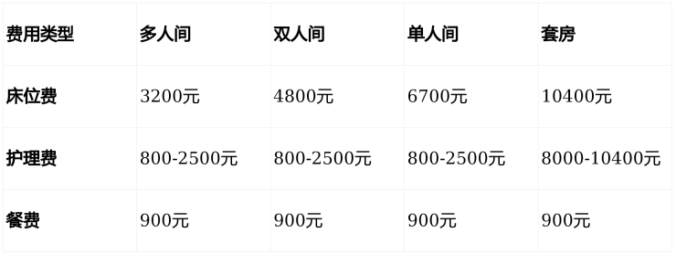 ② 护理费:自理级800元/月,半自理级1500元/月,全护理级2500元/月,特需级8000-10400元/月;