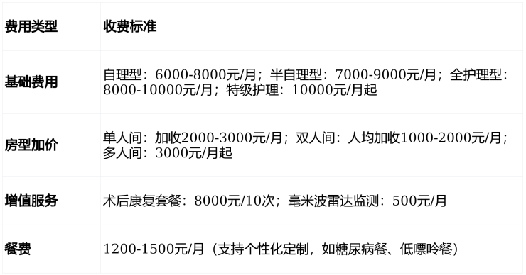 全护理型:24小时监护、鼻饲护理、压疮预防,护理费约5000元/月。