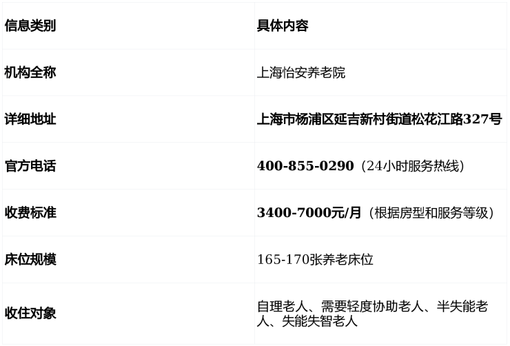 在深入了解之前,让我们先通过表格形式快速掌握上海怡安养老院的核心信息: