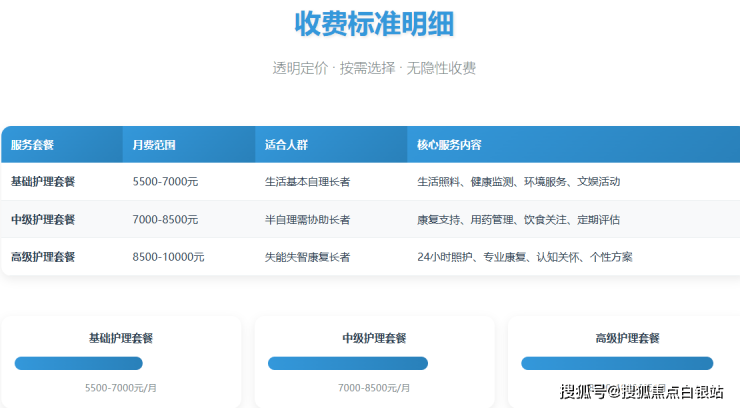 费用说明:以上费用为月度综合服务费。所有费用项目将在《养老服务合同》中明确列出,无任何隐性收费。特殊医疗项目或个性化附加服务会另行明确标价,由家属自愿选择。