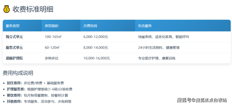 服务式公寓/护理院/会籍公寓:通常包含床位费/房费和基础服务费。床位费根据房间朝向、面积和楼层有所不同;基础服务费涵盖了物业管理、公共区域维护、基础安保等。
