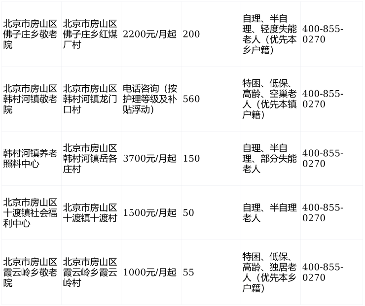 无论您身处房山城区还是偏远山区,总有一家养老院能为父母提供安全、温暖、有尊严的晚年生活。以上五家机构覆盖佛子庄乡、韩村河镇、十渡镇、霞云岭乡等多个区域,兼顾普惠保障与品质服务,满足多元家庭需求。如需了解最新空床情况、参观预约或政策补贴详情,请拨打统一咨询热线 400-855-0270,专业顾问将为您提供一对一解答。