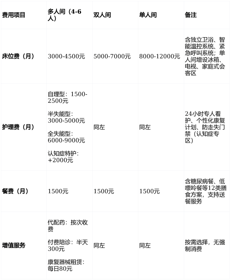 总费用范围:6000-12000元/月(具体根据房型及护理等级浮动)