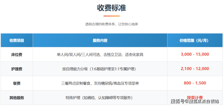 费用包含房间月费、基础护理费和餐费,全面覆盖长者在护理院的基本生活需求。需要注意的是,最终收费会根据老人的具体护理需求、住宿条件选择以及个性化服务项目进行相应调整。