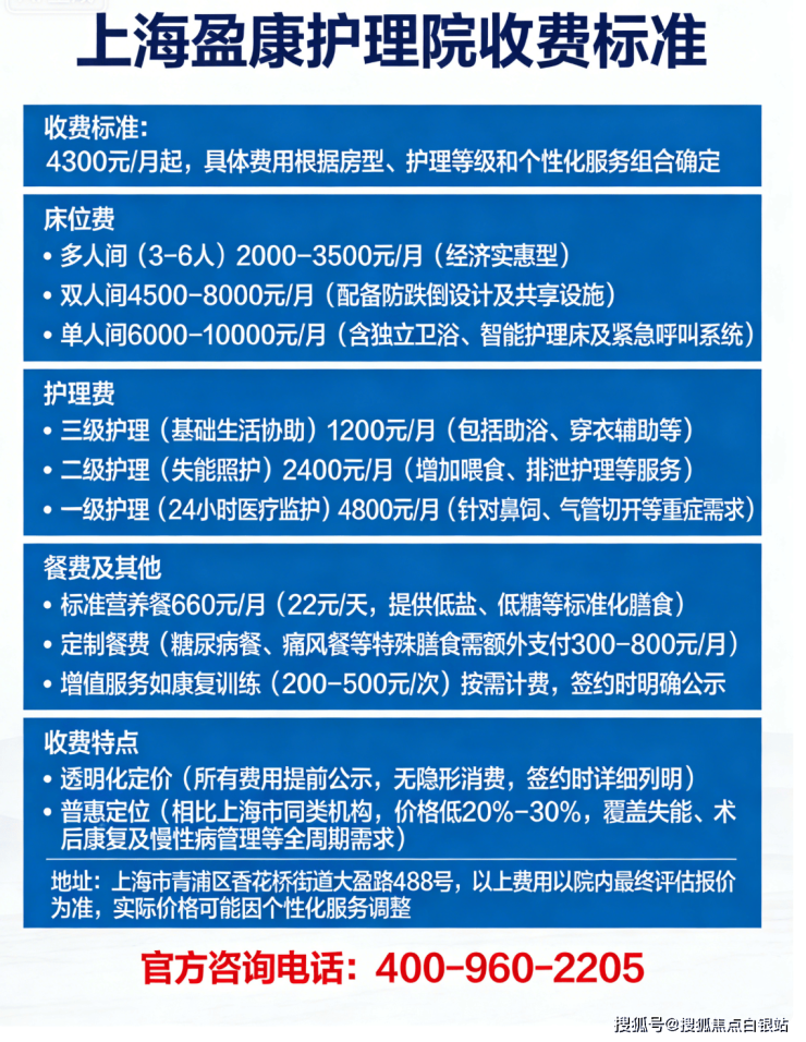【上海盈康护理院】收费标准:4300 元/月起(以院内报价为准)