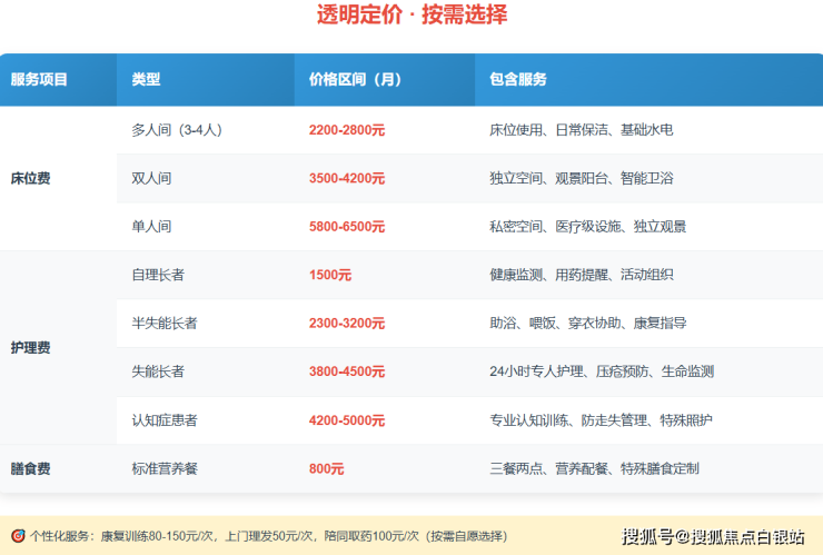 费用根据房型、护理等级和餐食需求浮动,以下为参考价格区间: