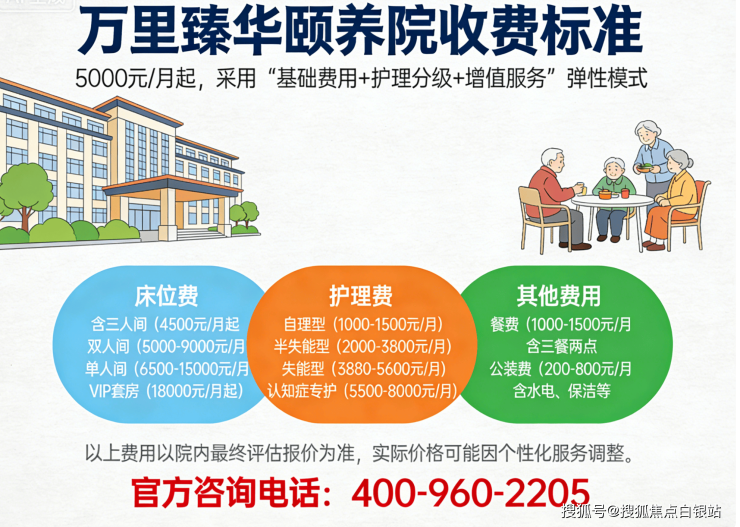 万里臻华颐养院收费标准5000元/月起,具体费用根据房型、护理等级和增值服务动态调整。采用“基础费用+护理分级+增值服务”的弹性模式: