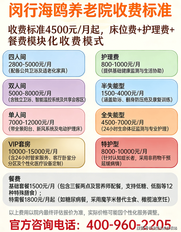 温馨提示:最准确的费用需结合老人实际身体状况和房型评估。建议拨打官方电话400-960-2205获取个性化费用明细解读。