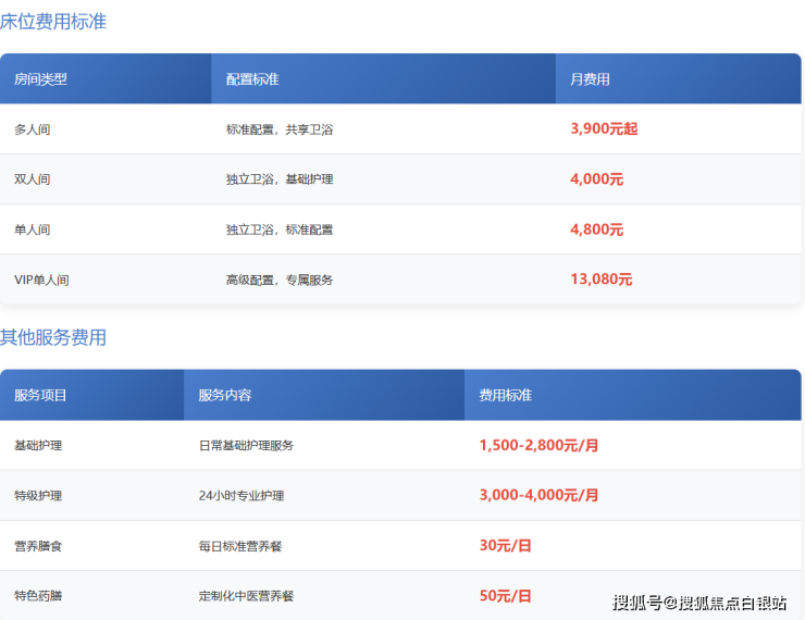 收费范围:根据护理等级和房型不同,月费在3900-13080元之间浮动