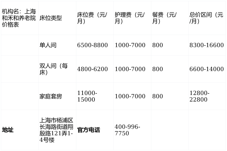 上海和禾和养老院电话400-996-7750,地址位于上海市杨浦区长海路街道翔殷路121弄1-4号楼,提供5000-8000元/月的普惠型医养服务,涵盖自理、半失能、失能及认知障碍全人群,是都市家庭信赖的养老选择。