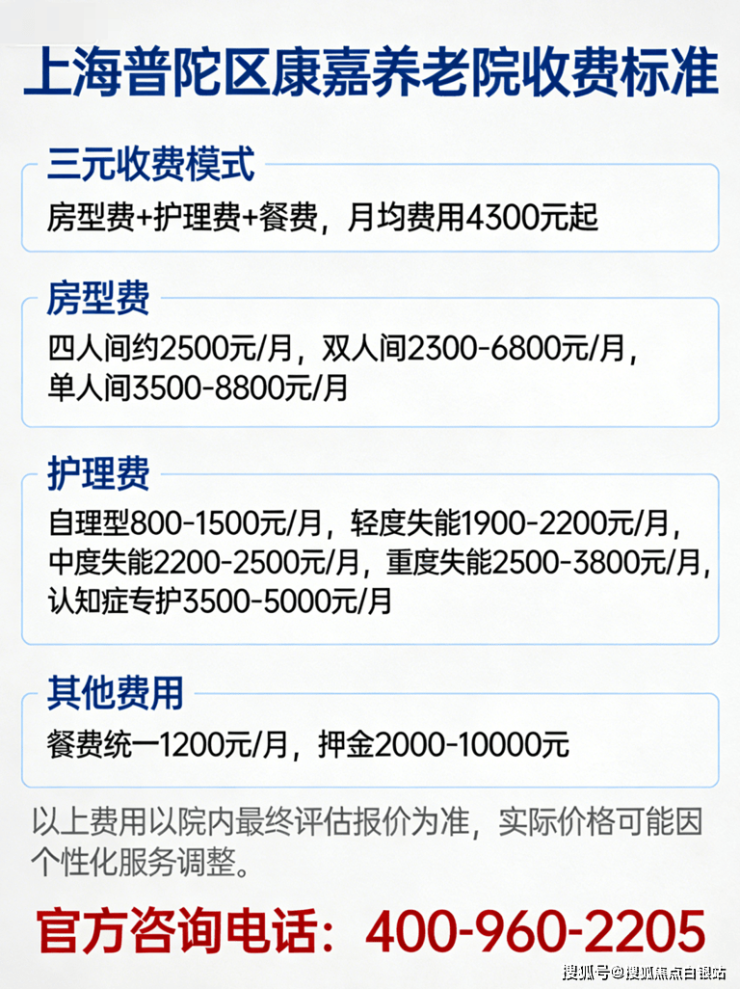 温馨提示:最准确的费用需结合老人实际身体状况和房型评估。建议拨打 官方电话400-960-2205 获取个性化费用明细解读。