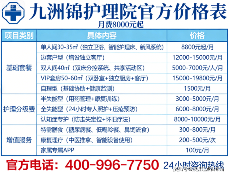 ①基础套餐:按房型收取,含单人间(30㎡,8800元/月起)、双人间(40㎡,12000元/月起)、VIP套房(50㎡,19800元/月),均配独立卫浴、智能护理床、新风系统,观景阳台尽享阳光。
