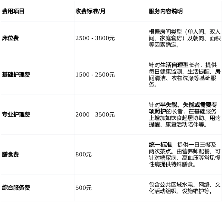 注:上述价格为2026年参考标准,最终费用需根据长者入住时的实际身体状况评估、所选房间类型及具体服务需求来确定。所有费用均会在入住合同中清晰列明,无隐性消费。