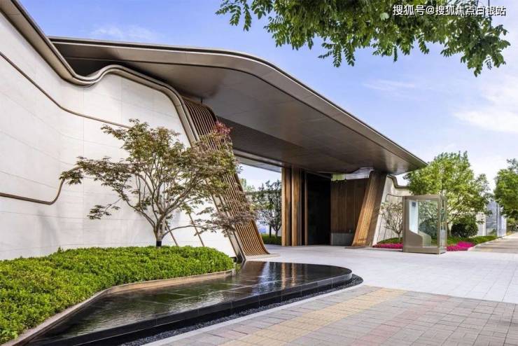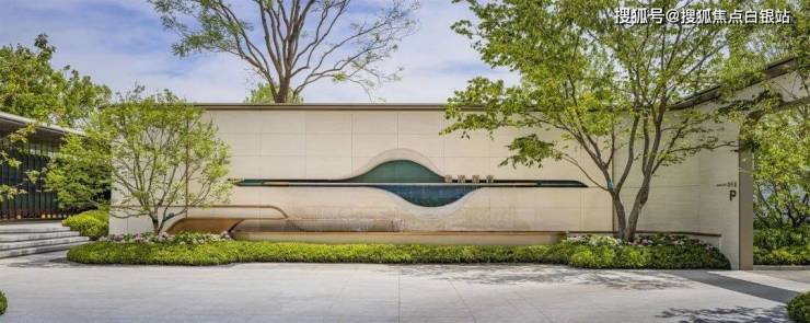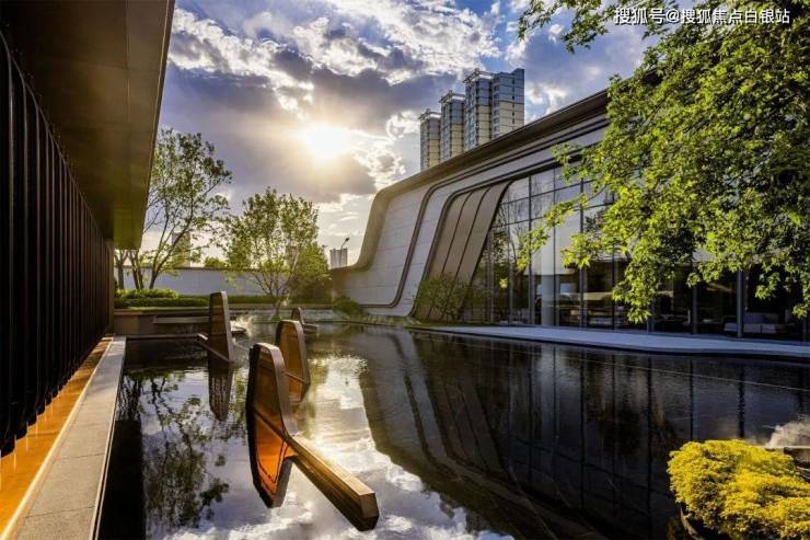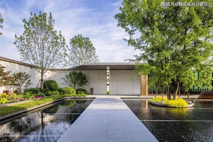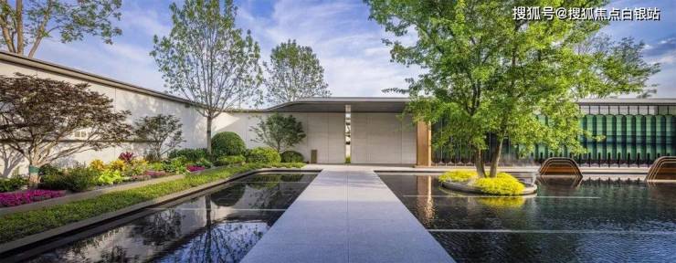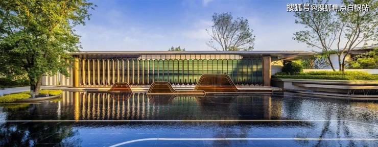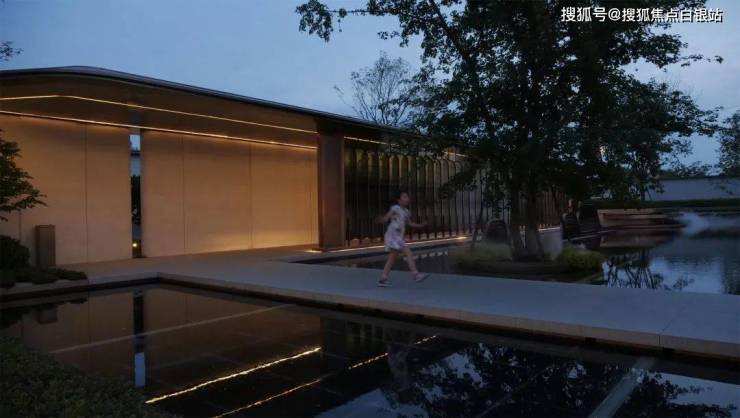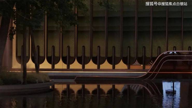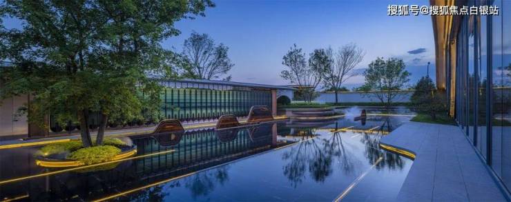 水庭之上, 高大的建筑如同宫殿般映入眼帘, 气势恢宏。晓月初升,抚照清池,池中极简的山形线条景观小品与建筑的倒影错落呼应,在开阔而平静的水面上描绘的是《千里江山图》中平湖映群山的场景。