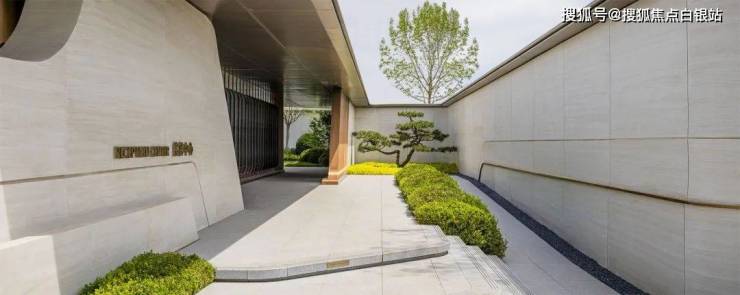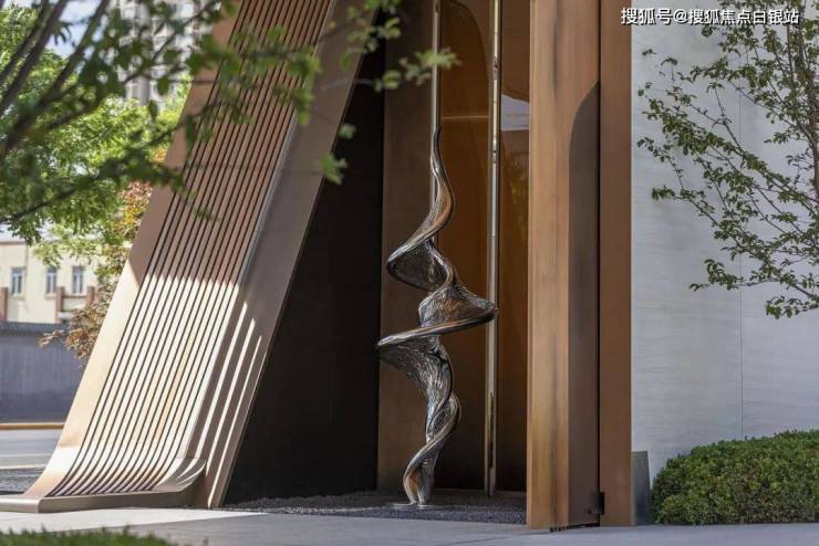 首幅画卷取宋徽宗《瑞鹤图》画境,宫门屋脊化为入口门头的悬挑平檐,彰显出尊贵大家的气势,矗立的高大门头与整体围墙形成连续统一的立面形象, 给人以肃穆庄重之感;图中瑞鹤翩然飞舞,落地抽象成为“鹤舞”雕塑,在静穆的氛围中平添一丝轻巧灵动之感。