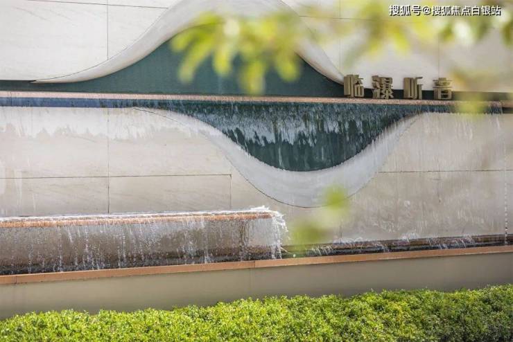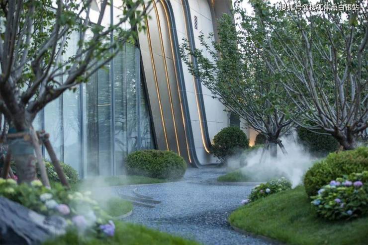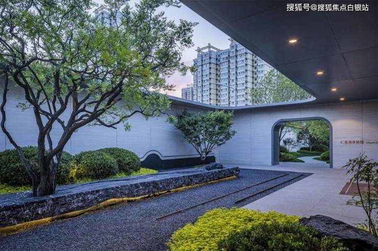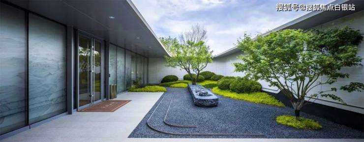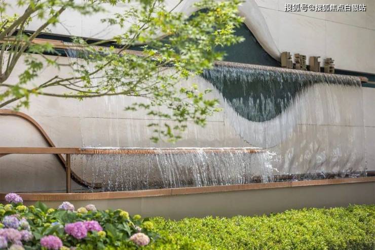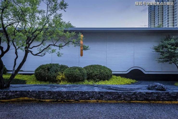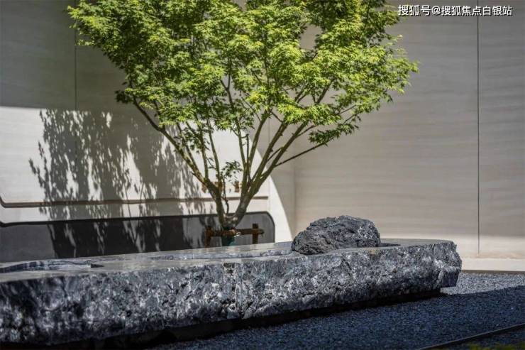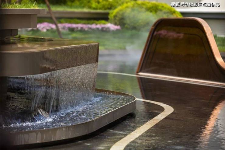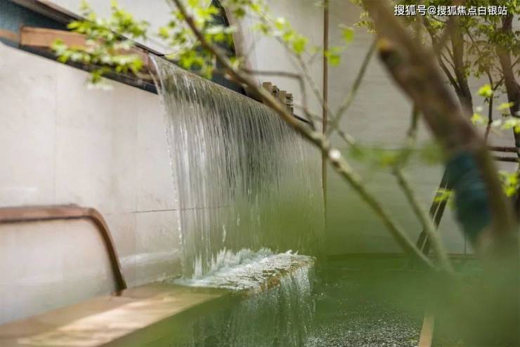 一进到达庭院以营造潺潺的水声为主题,以山形抽象而成的流畅线条于入口景墙之上,晨光初照,水雾朦胧。跌落的水幕撞击地面碎石与悬挑的铜片,发出不同的音色, 泠泠作响,犹如迎宾的奏乐,场景意向出自《千里江山图》的山间瀑布。