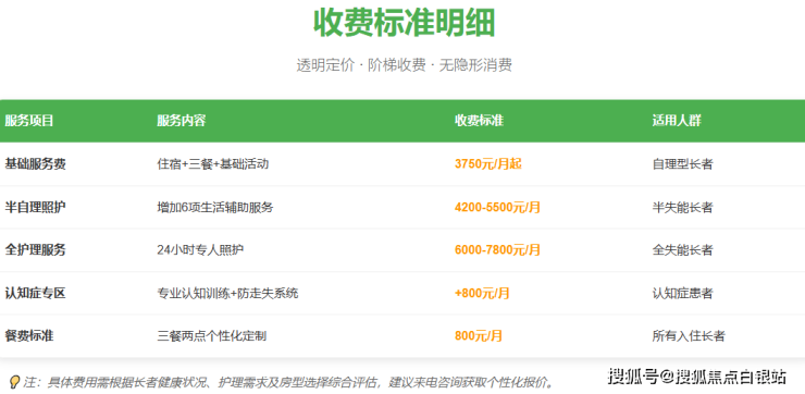 基础服务费:3750元/月起,覆盖住宿、三餐、基础护理、健康监测等基础服务。