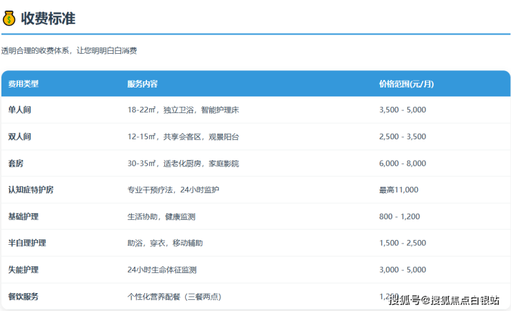 基础套餐:5050元/月起,包含住宿、餐饮、基础护理服务。