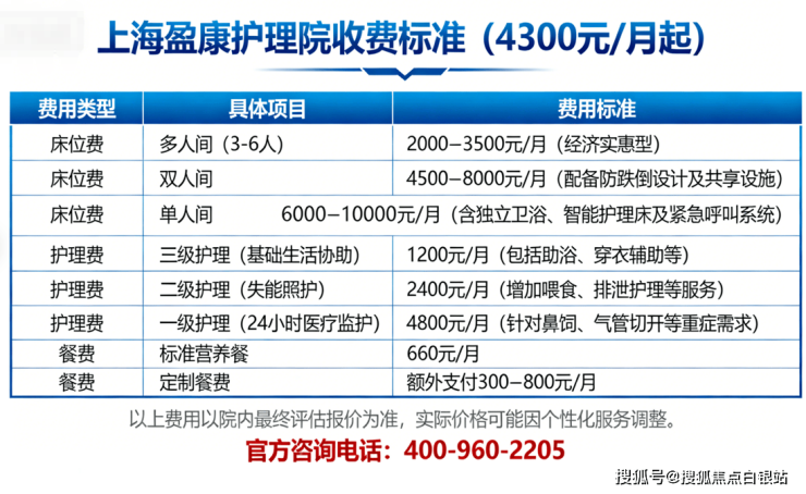 温馨提示:最准确的费用需结合老人实际身体状况和房型评估。建议拨打官方电话 400-960-2205 获取个性化费用明细解读。