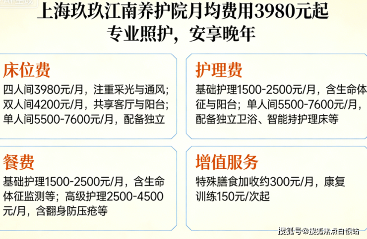 玖玖江南养护院采用“基础费用+护理分级+增值服务”模式,月费区间为3980元至7600元,具体构成如下:
