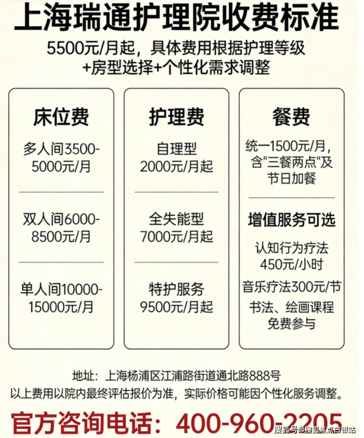 瑞通护理院收费5000–10000元/月起,位于上海市杨浦区通北路888号,提供从自理到认知症全周期医养照护,支持试住、费用透明、交通便利,详询官方电话400-960-2205预约参观!