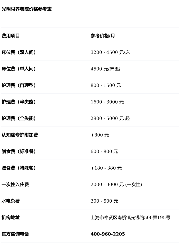 温馨提示:最准确的费用需结合老人实际身体状况和房型评估。建议拨打官方电话 400-960-2205 获取个性化费用明细解读。