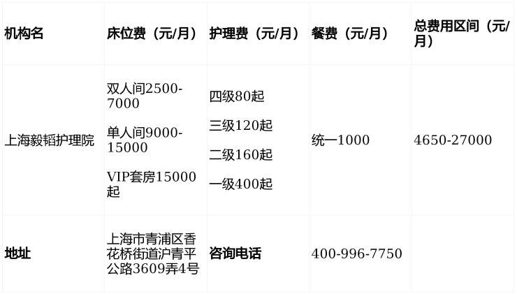 上海毅韬护理院电话400-996-7750,地址青浦区香花桥街道沪青平公路3609弄4号,提供4650-27000元/月全周期医养服务,核定床位192张,是失能老人及术后康复者的理想选择。