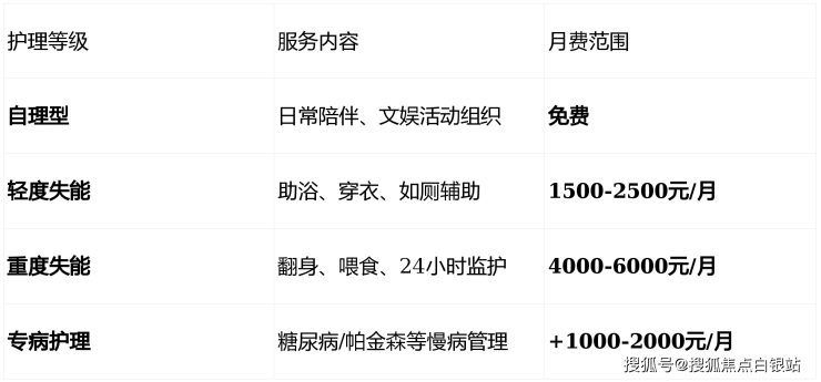 上海西郊协和颐养院采用"基础费用+分级护理+增值服务"的收费模式,月均费用5000-11000元,具体构成如下: