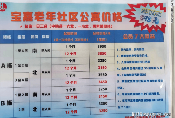 ⚠️ 价格说明:价格含三餐,水5吨,电50度,以上为2026年官方价格标准,实际费用需根据长者身体状况、房型及服务项目评估确定,请以院内最新报价为准。