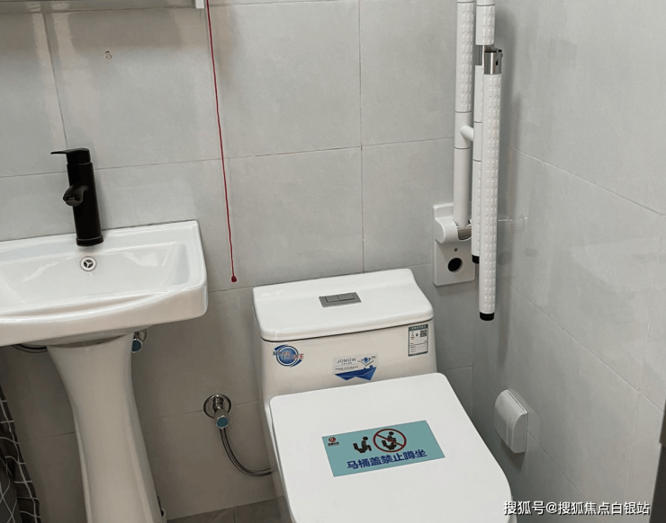 卫生间配备助力扶手、紧急呼叫按钮、防滑地砖。