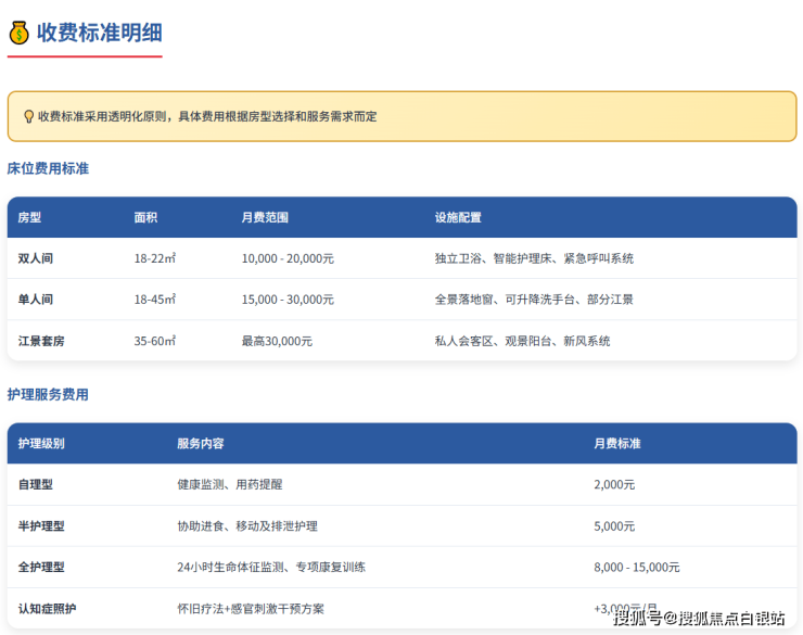 所有费用包含住宿、护理、餐饮、基础医疗及文化活动等基础服务。