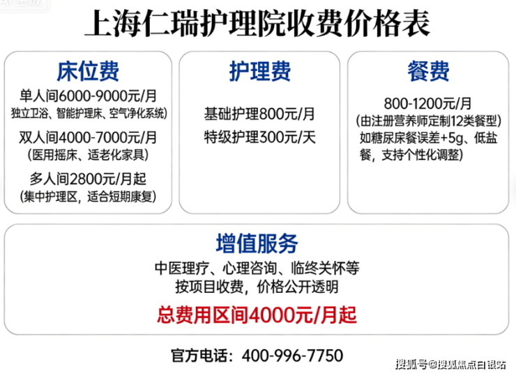 收费价格:4000元/月起(含床位、护理、餐费及基础服务)