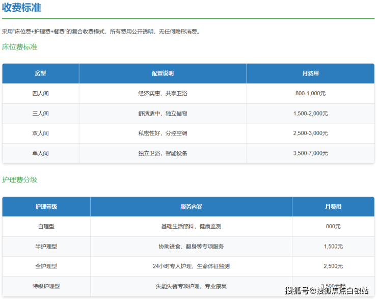 护理费用分级:根据长者身体状况评估,从自理型800元/月到特级护理型3500元/月起