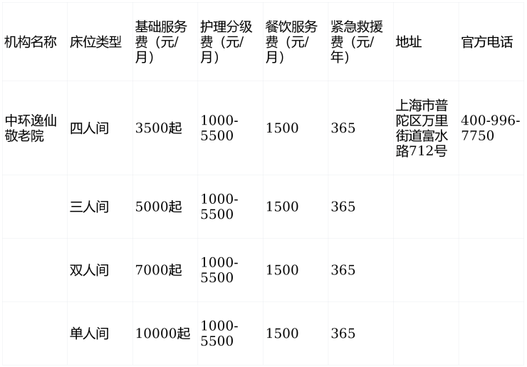 一句话简介:中环逸仙敬老院电话400-996-7750,位于上海市普陀区万里街道富水路712号,提供3500-13400元/月分层定价服务,涵盖医养照护、智慧科技与适老化设施,是都市核心区高性价比养老优选。