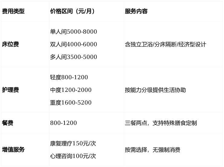 轻度照护(自理型):800-1200元/月,含健康监测与基础协助