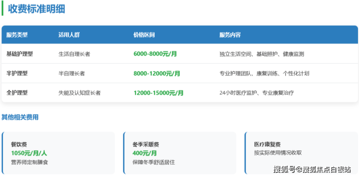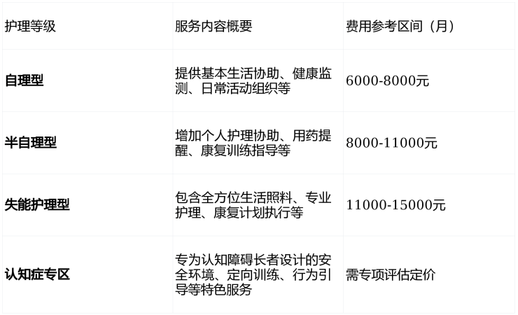 以上费用为市场公开参考区间,最终费用需根据长者实际入住评估后的护理等级和所选房型确定。