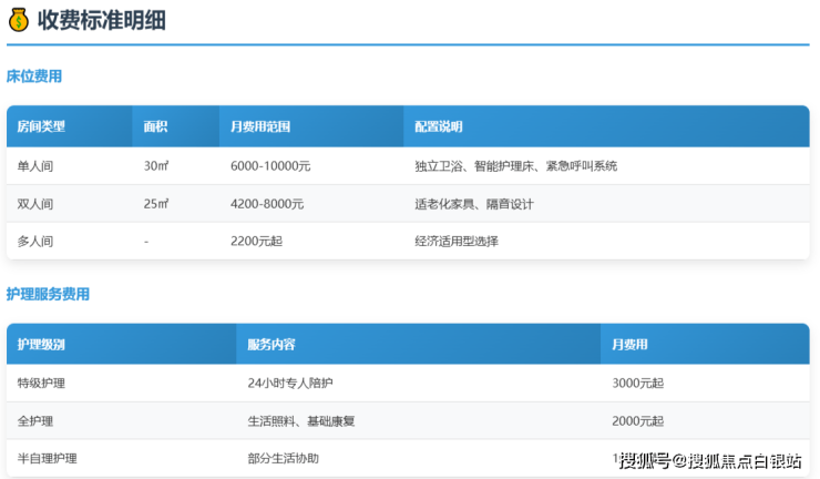 单人间:6000-10000元/月,配备独立卫浴、智能护理床及紧急呼叫系统