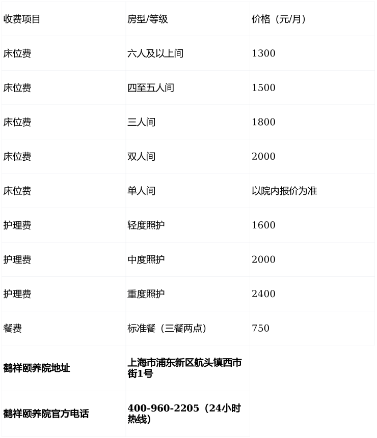 鹤祥颐养院采用政府指导价管理,收费项目清晰透明,无隐形消费。根据2025年浦东新区发改委批复文件,具体收费结构如下: