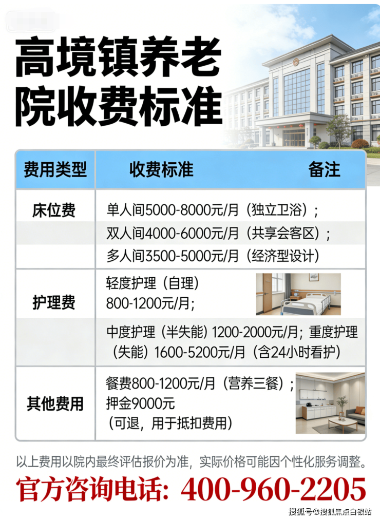 高境镇养老院的收费标准4750元/月起,具体费用根据房型、护理等级和附加服务浮动。主要费用构成如下: