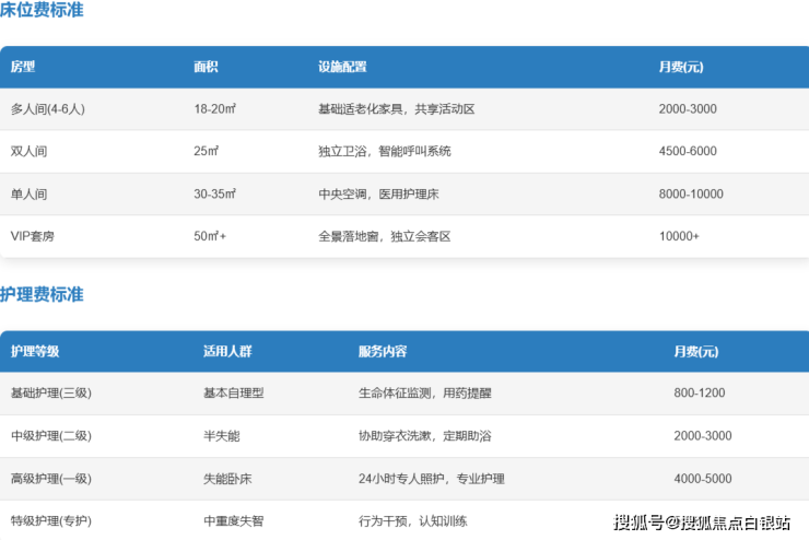 单人间:8000-10000元/月。面积30-35㎡,保障完全私密性,配备中央空调、医用护理床、干湿分离卫浴