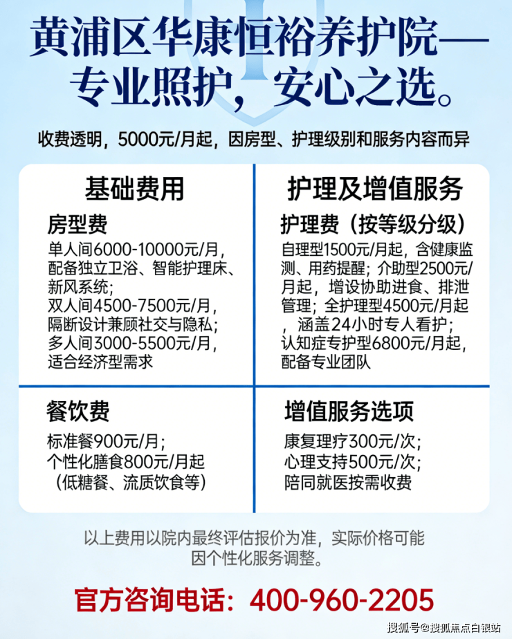 温馨提示:最准确的费用需结合老人的具体情况和所选房型进行评估。建议您拨打官方电话 400-960-2205 获取个性化的费用明细解读。