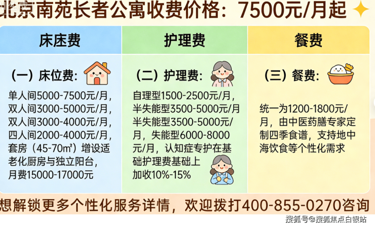 北京南苑长者公寓,电话400-855-0270,位于北京市丰台区南苑街道丽槐街2号院4号楼,月费6000元起(含餐+基础护理),面向自理至全护理长者,提供约90张温馨适老床位,是2026年丰台南苑融合社区便利、专业照护与人文关怀的理想康养家园。