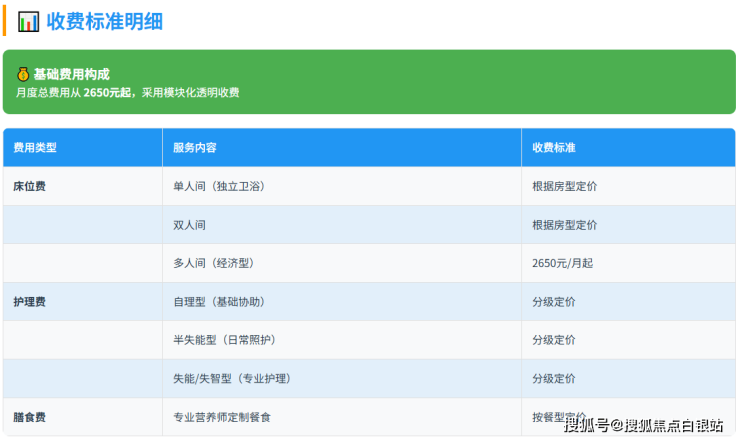 参考价格区间:采用 “床位费+护理费+餐费” 的透明化收费模式,月度综合费用从2650元起。具体费用根据长者实际选择的房型、所需护理等级及餐饮标准组合确定。