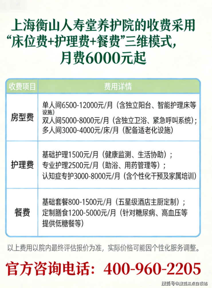 温馨提示:最准确的费用需结合老人的具体情况和所选房型进行评估。建议您拨打官方电话 400-960-2205 获取个性化的费用明细解读。