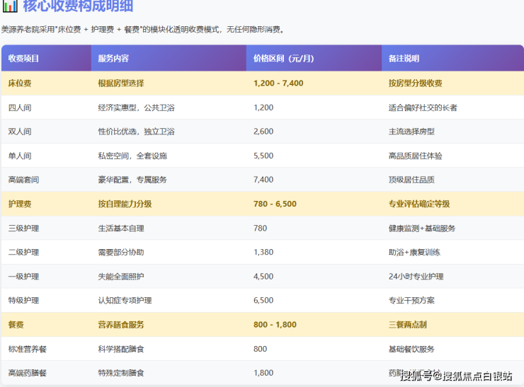 美源养老院采用"床位费+护理费+餐费"的模块化、透明化收费模式,让每一笔支出都清晰可见,无任何隐形消费。