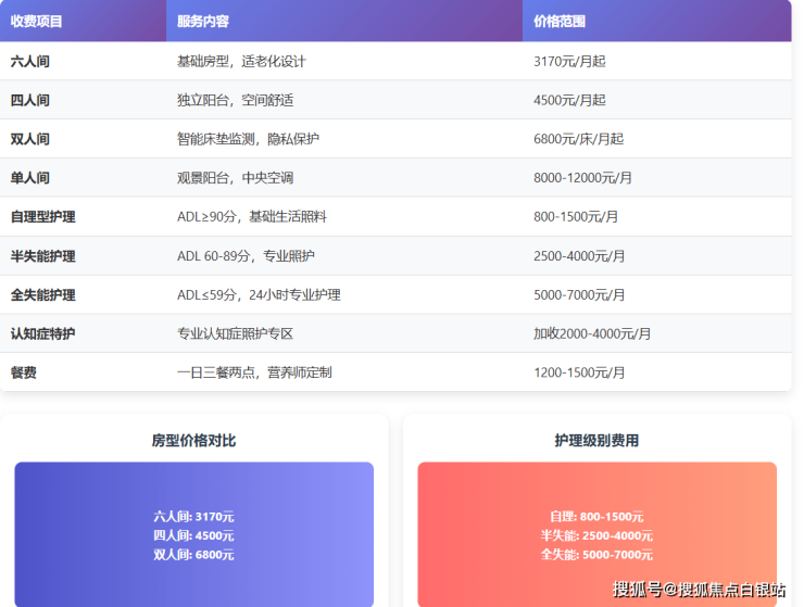彩虹湾老年福利院采用**"床位费+护理费+餐费"**的透明计价模式,具体费用构成如下: