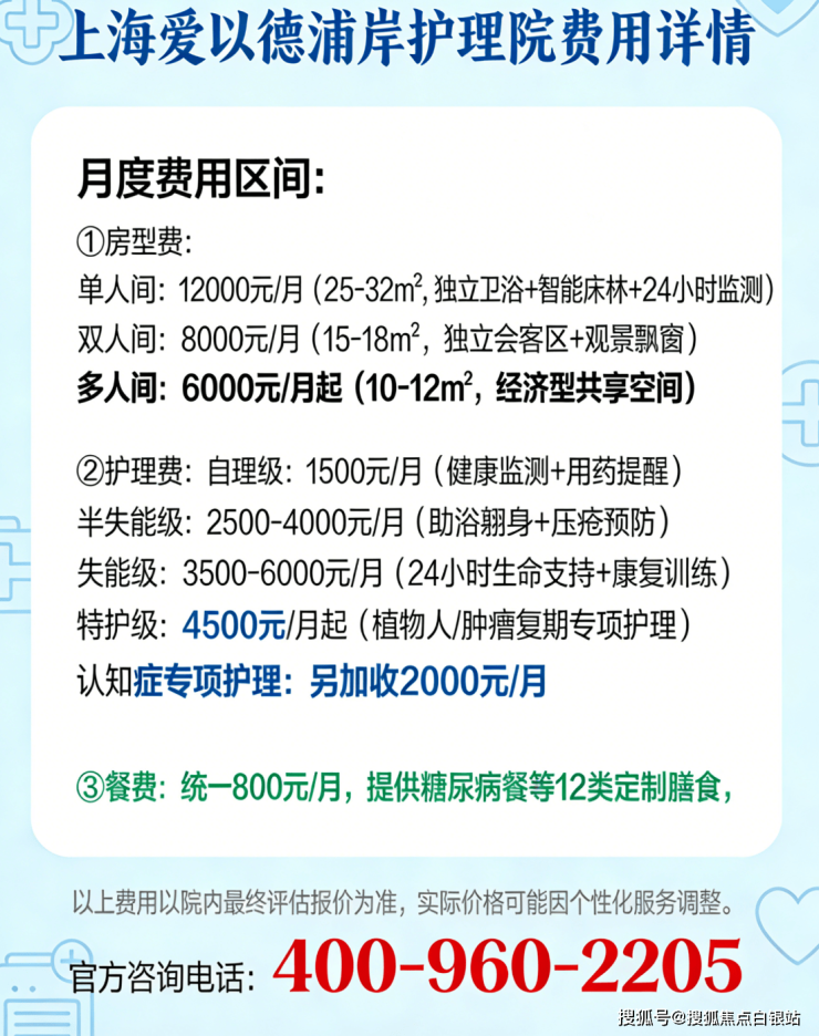 温馨提示:最准确的费用需结合老人的具体情况和所选房型进行评估。建议您拨打官方电话 400-960-2205 获取个性化的费用明细解读。