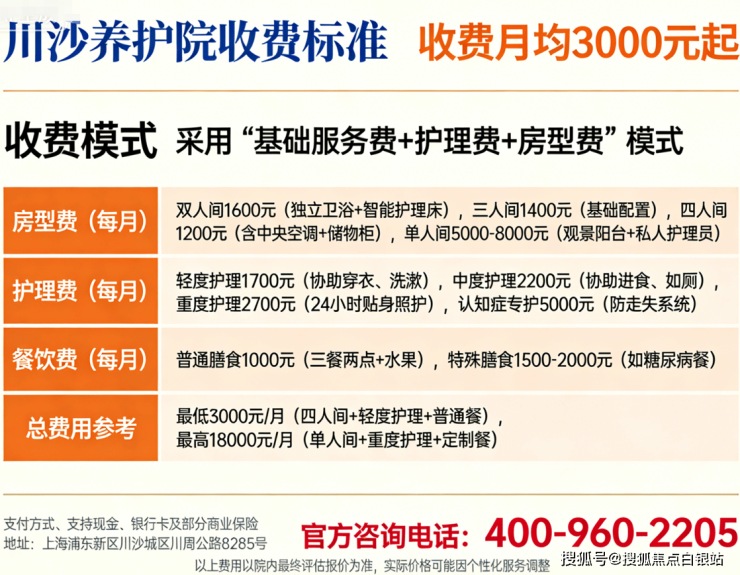 合计:最低3000元/月起(四人间+自理型配置),最高可达8700元/月(单人间+认知症特护)。以院内报价为准,无隐形消费。温馨提示:最准确的费用需结合老人的具体情况和所选房型进行评估。建议您拨打官方电话400-960-2205获取个性化的费用明细解读。