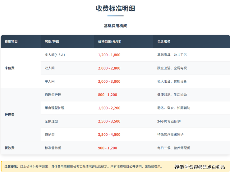费用说明:以上为综合市场信息的参考价格区间,最终费用需根据长者实际身体状况、所选房型及具体服务项目,经院方专业评估后确定。所有收费项目清晰列出,无隐藏费用。