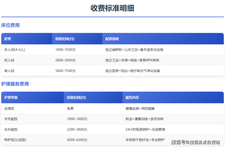 具体收费明细可拨打咨询电话400-855-0290获取最新报价单。所有收费均按照上海市物价局标准执行,在养老院大厅公示,确保公开透明。